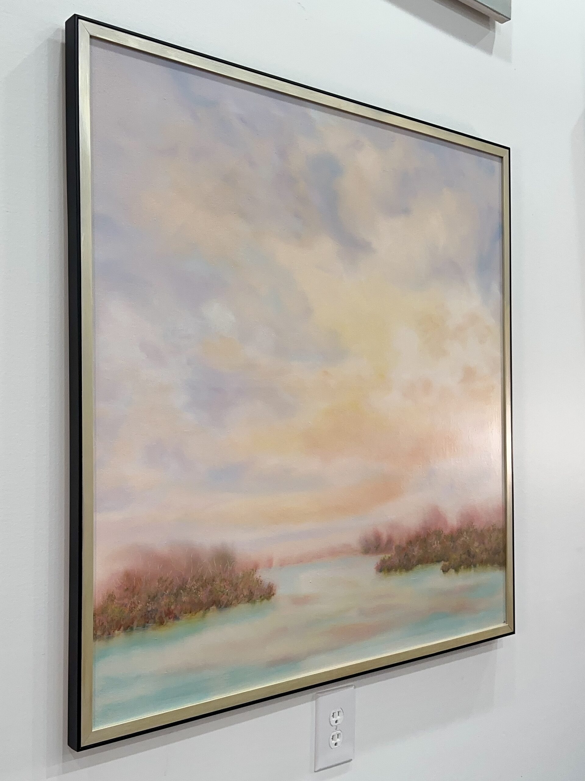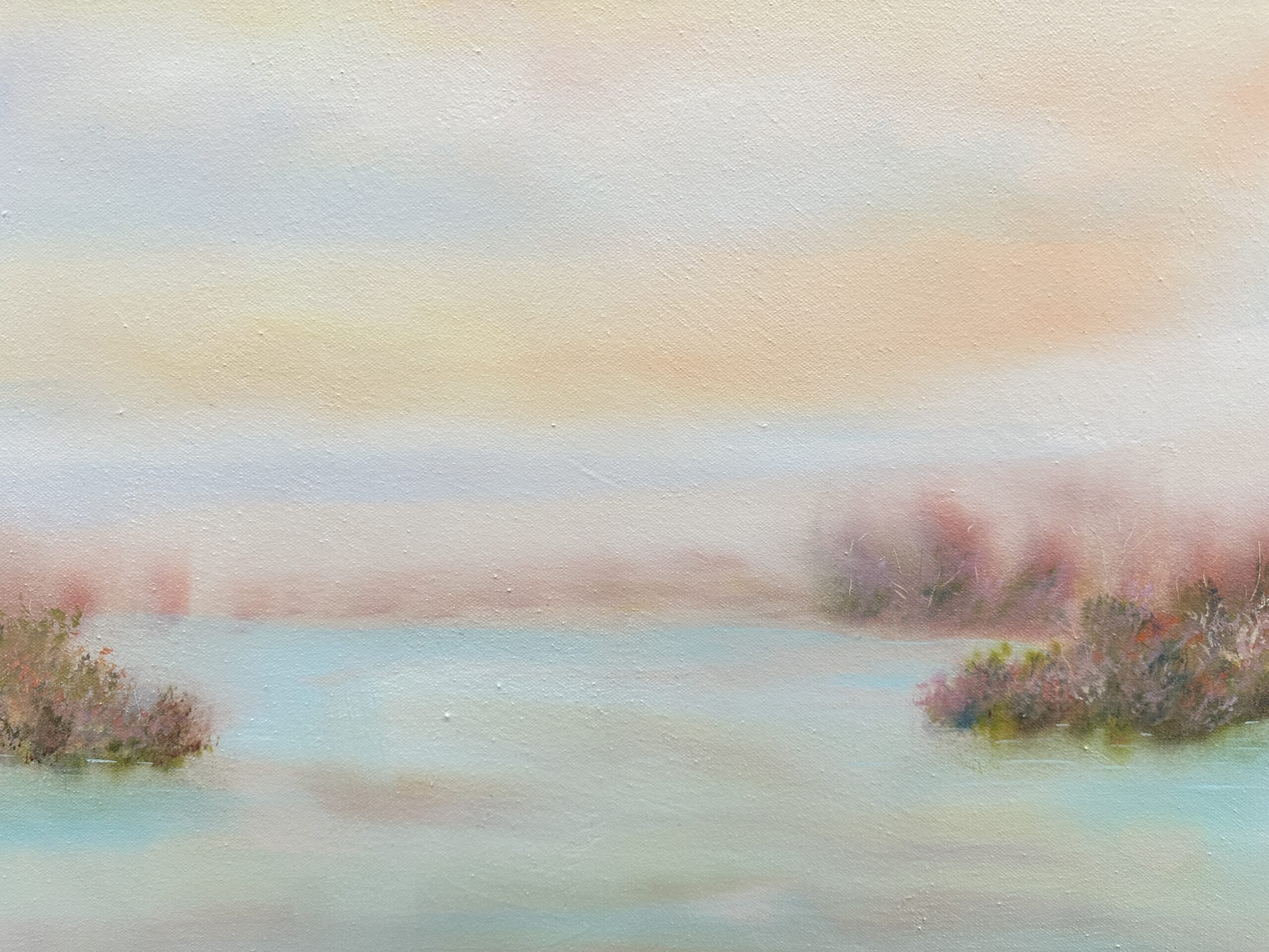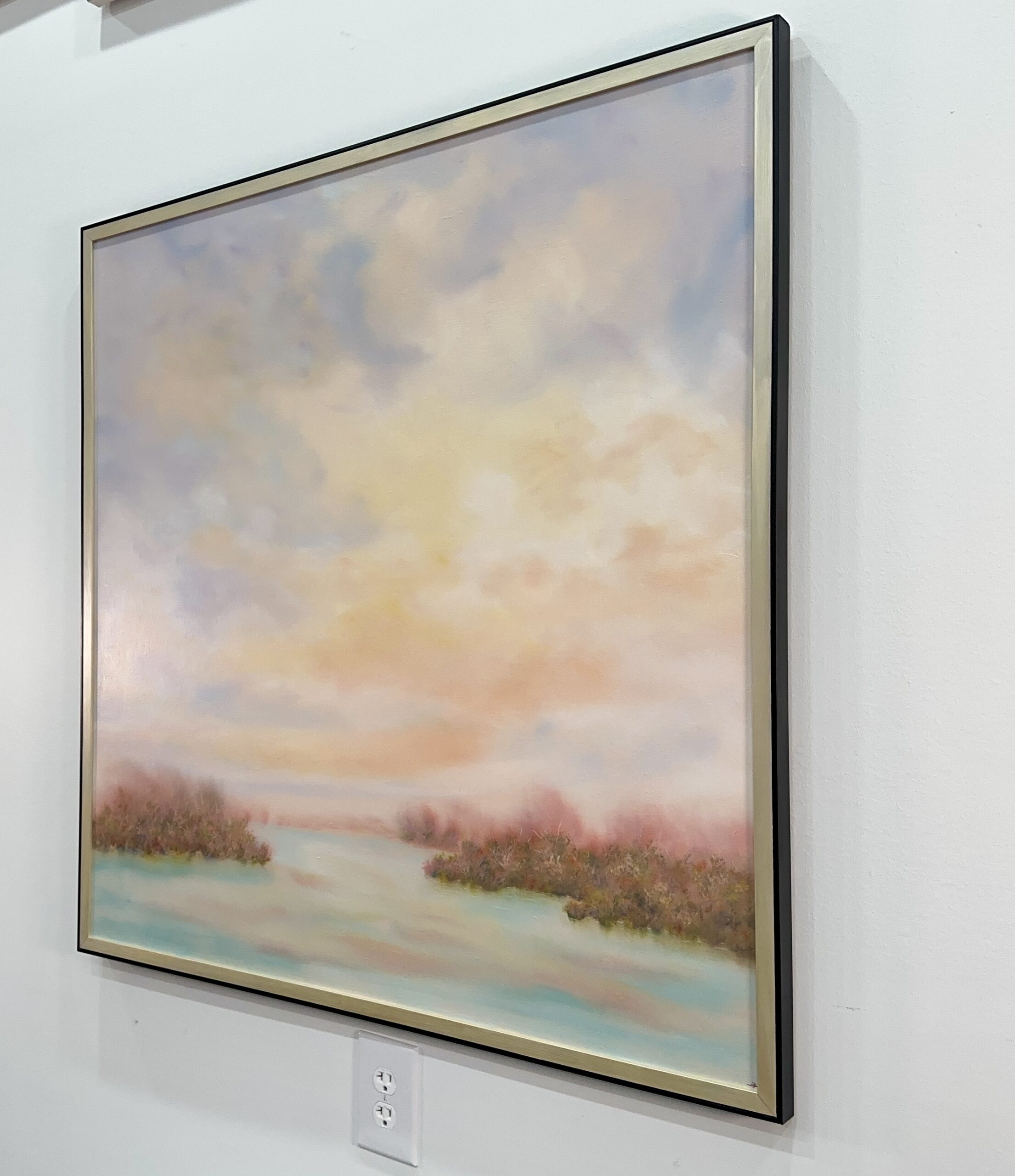 Acrylic on canvas. A soft wonderland filled with peace and tranquility. The tender touches of dawn illuminate a gentle land and still waters. 20+ layers of thin glazes. UV varnished. Framed. Wired and ready to hang. Shipping cost is high on this size, feel free to reach out for other delivery options.