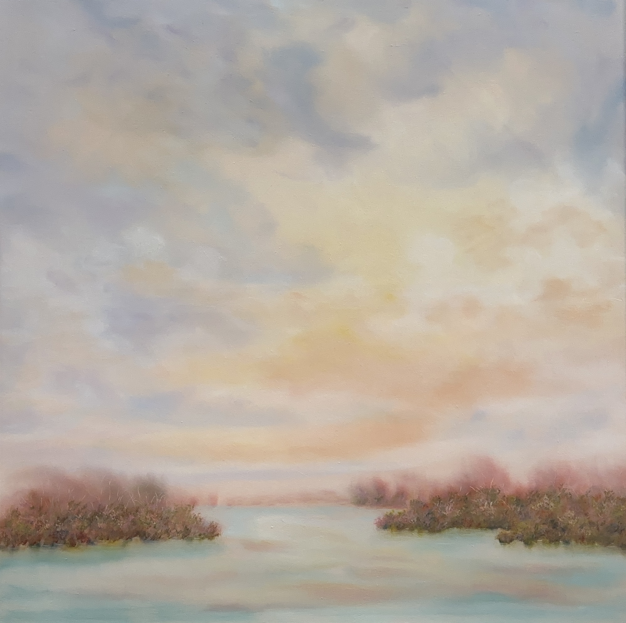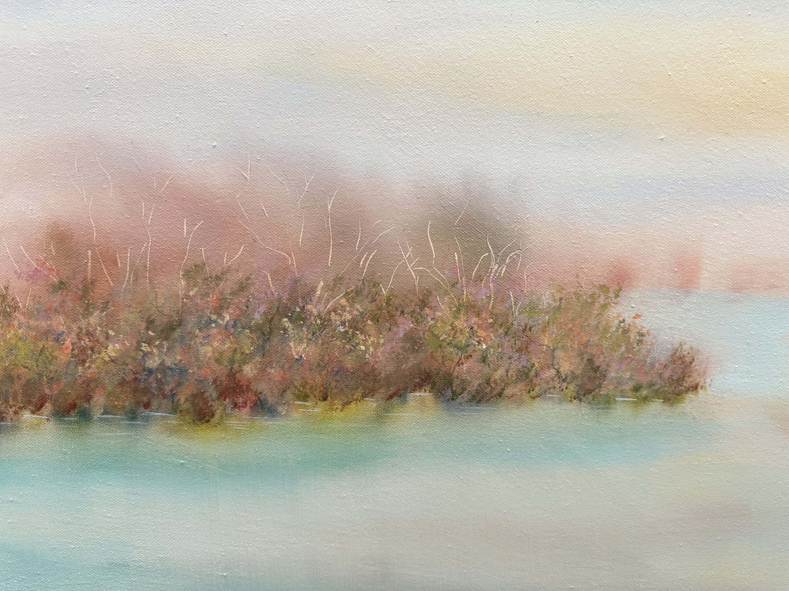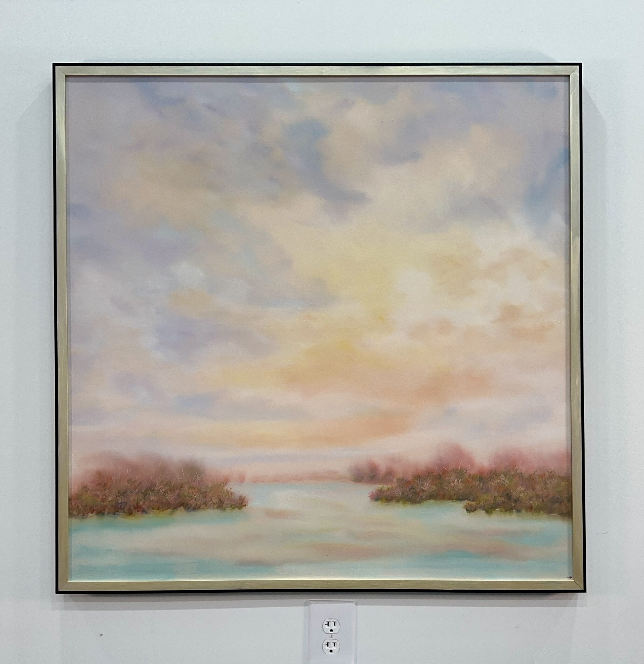 Acrylic on canvas. A soft wonderland filled with peace and tranquility. The tender touches of dawn illuminate a gentle land and still waters. 20+ layers of thin glazes. UV varnished. Framed. Wired and ready to hang. Shipping cost is high on this size, feel free to reach out for other delivery options.