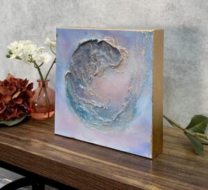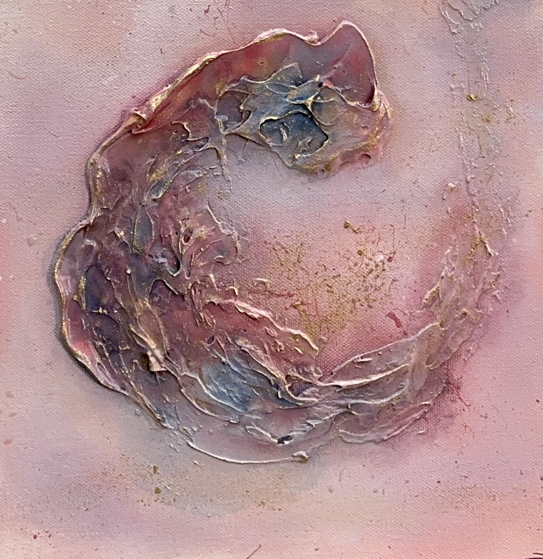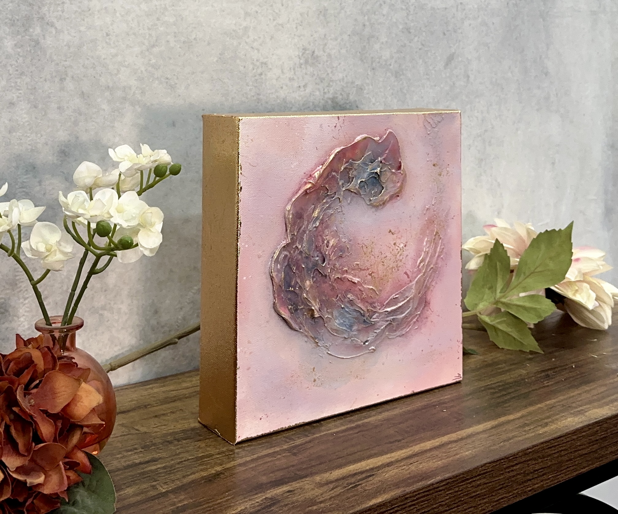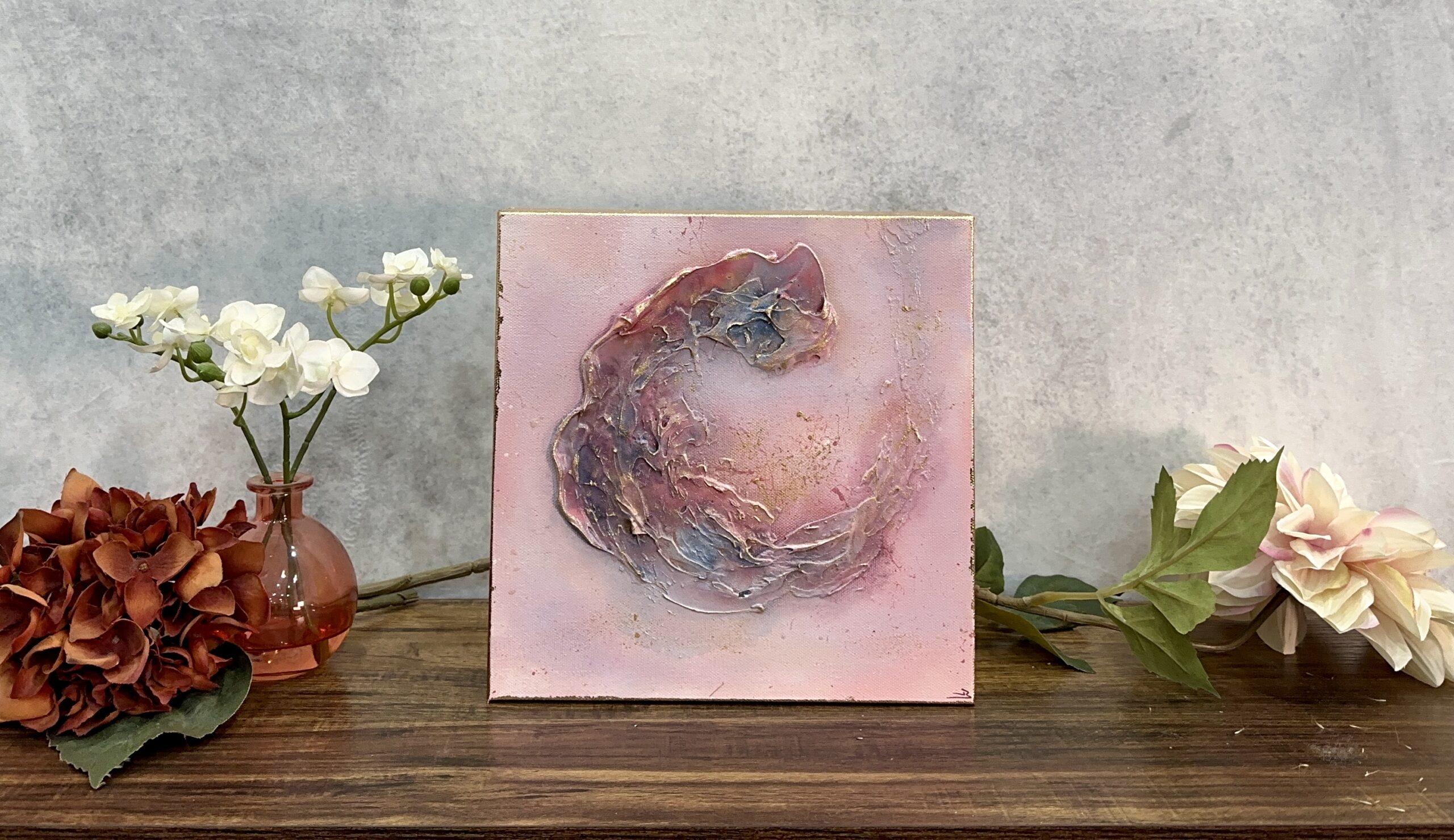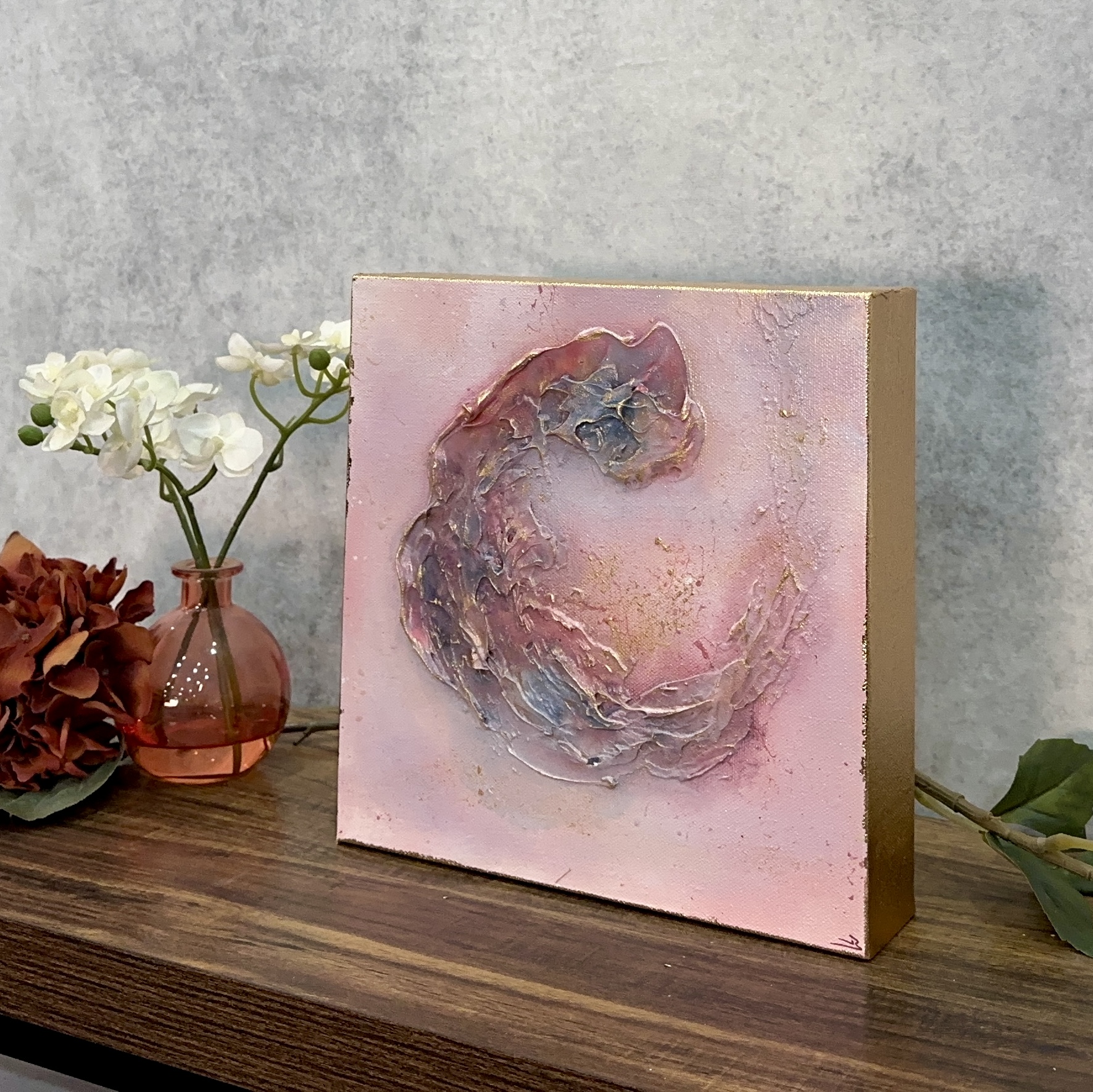 Acrylic on canvas. The Buddhist symbol for never ending – always beginning on warm rosy and mauve hues. These tiny abstracts can be set on a shelf as a decorative item or hung on a wall. Canvas edges are completely wrapped in gold leaf giving the painting an elegant ethereal feel. 2.5″ deep canvas. . UV varnished. Gold Leaf edged. Wired and ready to hang.