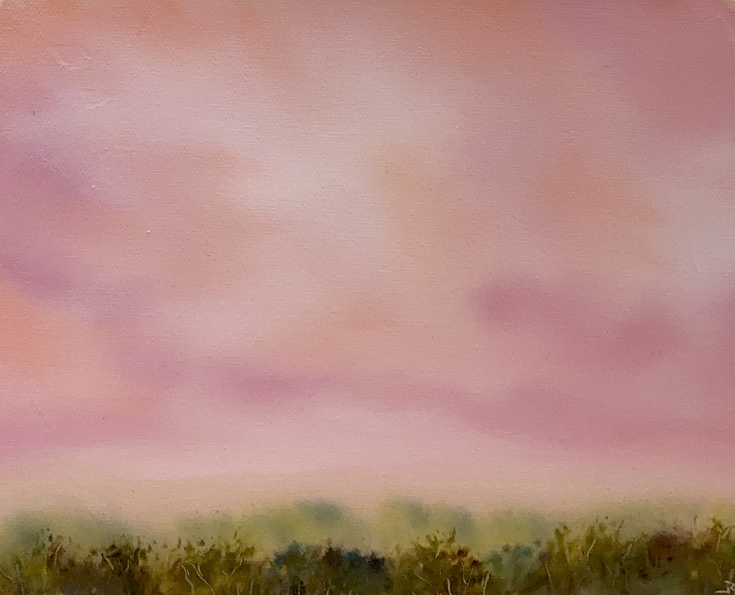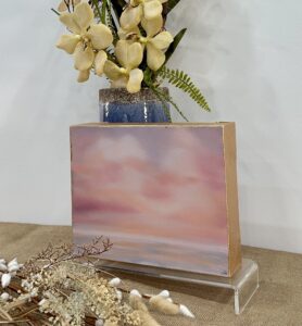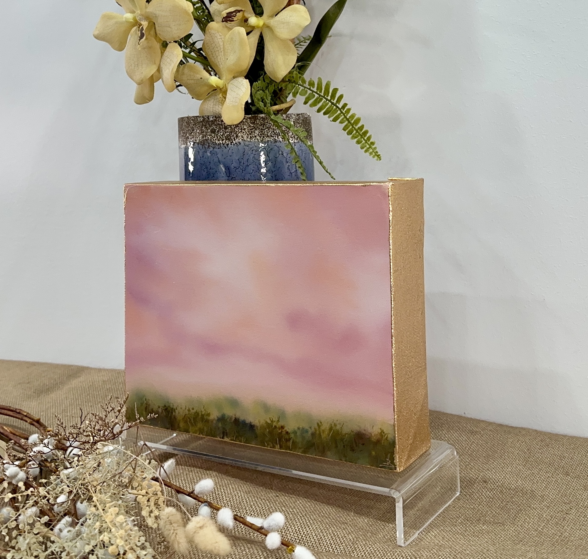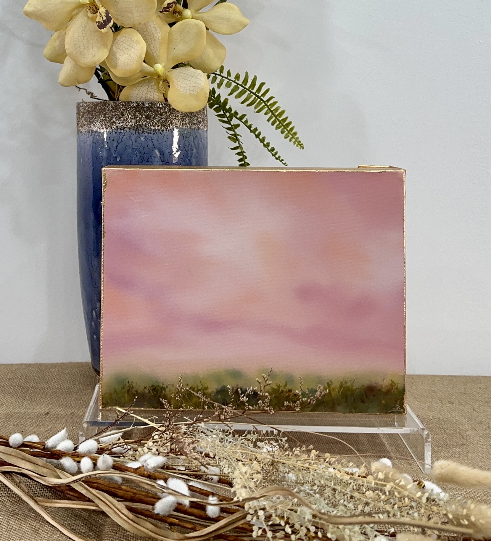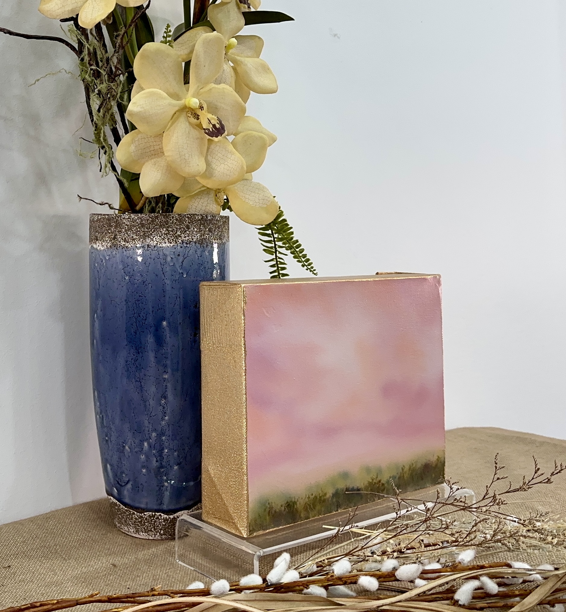 Acrylic on canvas. A birds eye view of the world. Soar high above the tree tops without a care in the world. These tiny landscapes can be combined to create a focus wall or placed on a shelf. Canvas edges are completely wrapped in gold leaf giving the painting an elegant ethereal feel. 2.5″ deep canvas. . UV varnished. Gold Leaf edged. Wired and ready to hang.
