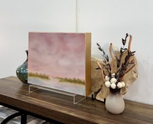 Acrylic on canvas. Wide open spaces give the soul a chance to breathe again, energize again, hope again. These tiny landscapes can be set on a shelf as a decorative item or hung on a wall. Canvas edges are completely wrapped in gold leaf giving the painting an elegant ethereal feel. 2.5″ deep canvas. . UV varnished. Gold Leaf edged. Wired and ready to hang.