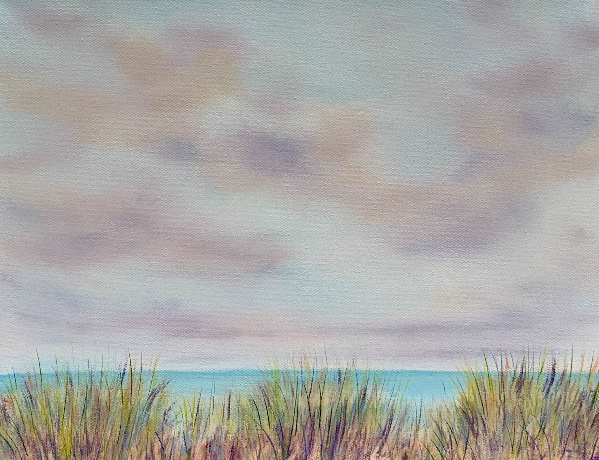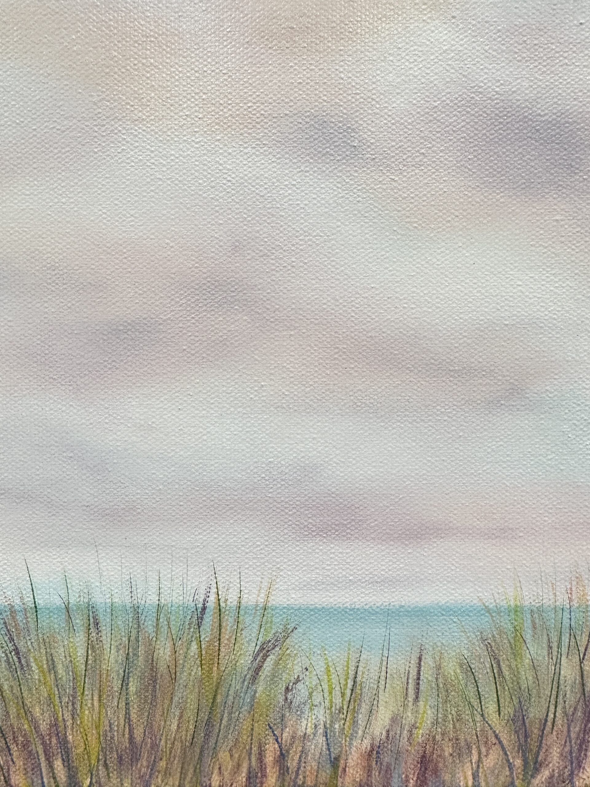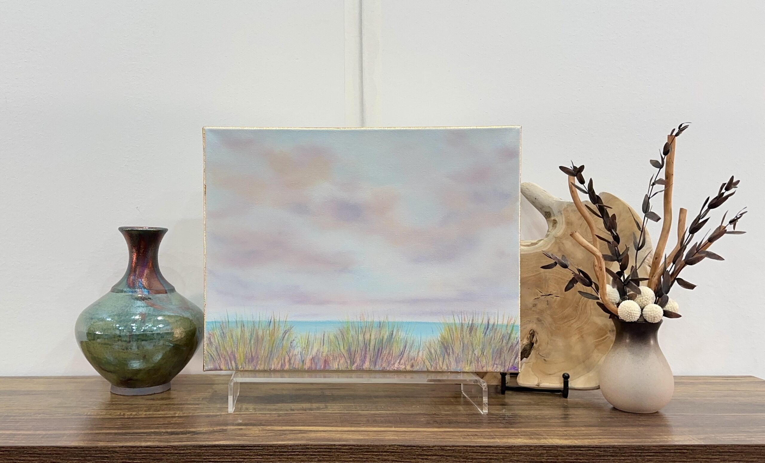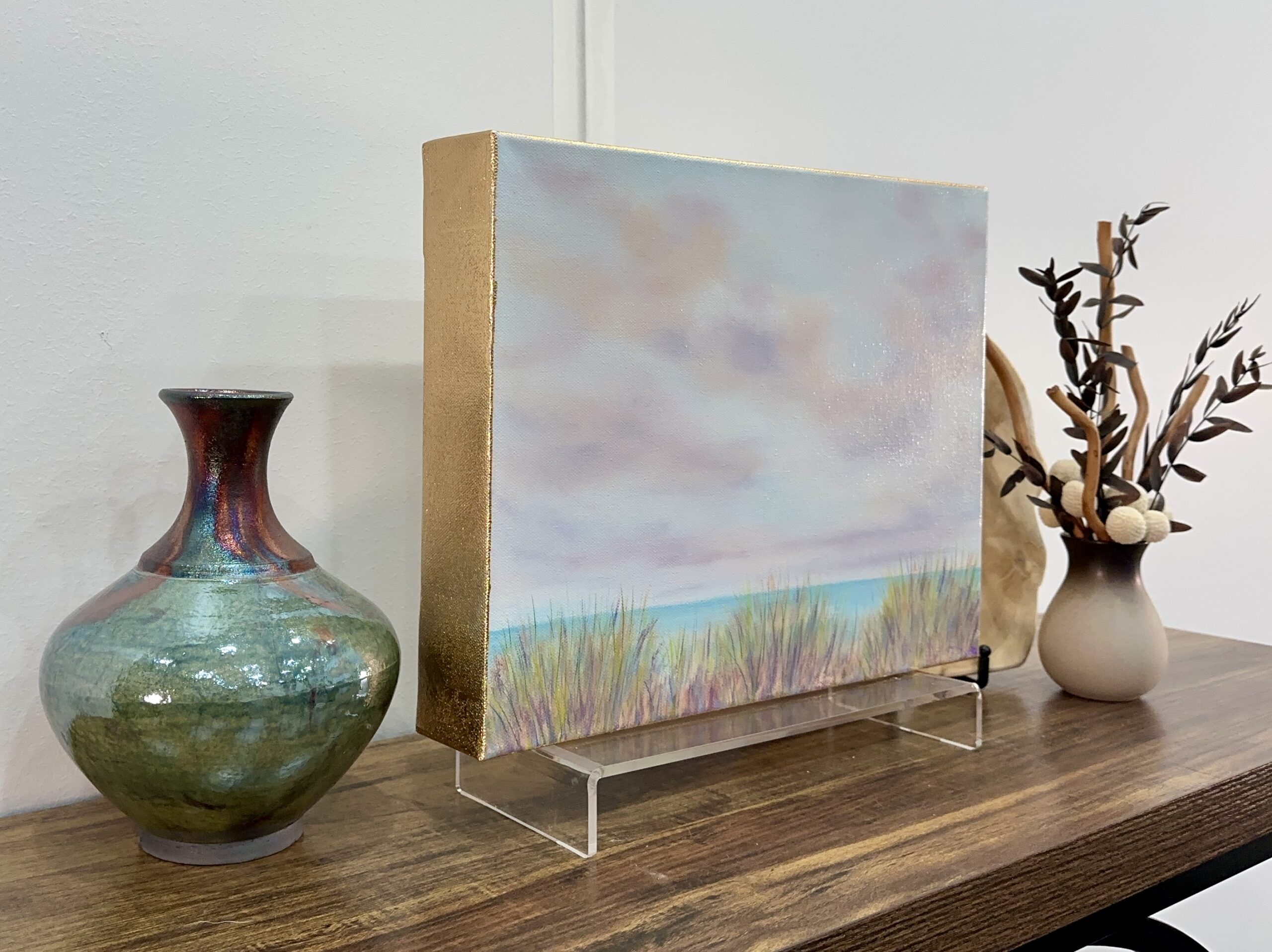 Acrylic on canvas. The sweet serenade of dune grasses rustling in a gently breeze accompanied by the rolling shoreline. These tiny landscapes can be set on a shelf as a decorative item or hung on a wall. Canvas edges are completely wrapped in gold leaf giving the painting an elegant ethereal feel. 2.5″ deep canvas. . UV varnished. Gold Leaf edged. Wired and ready to hang.