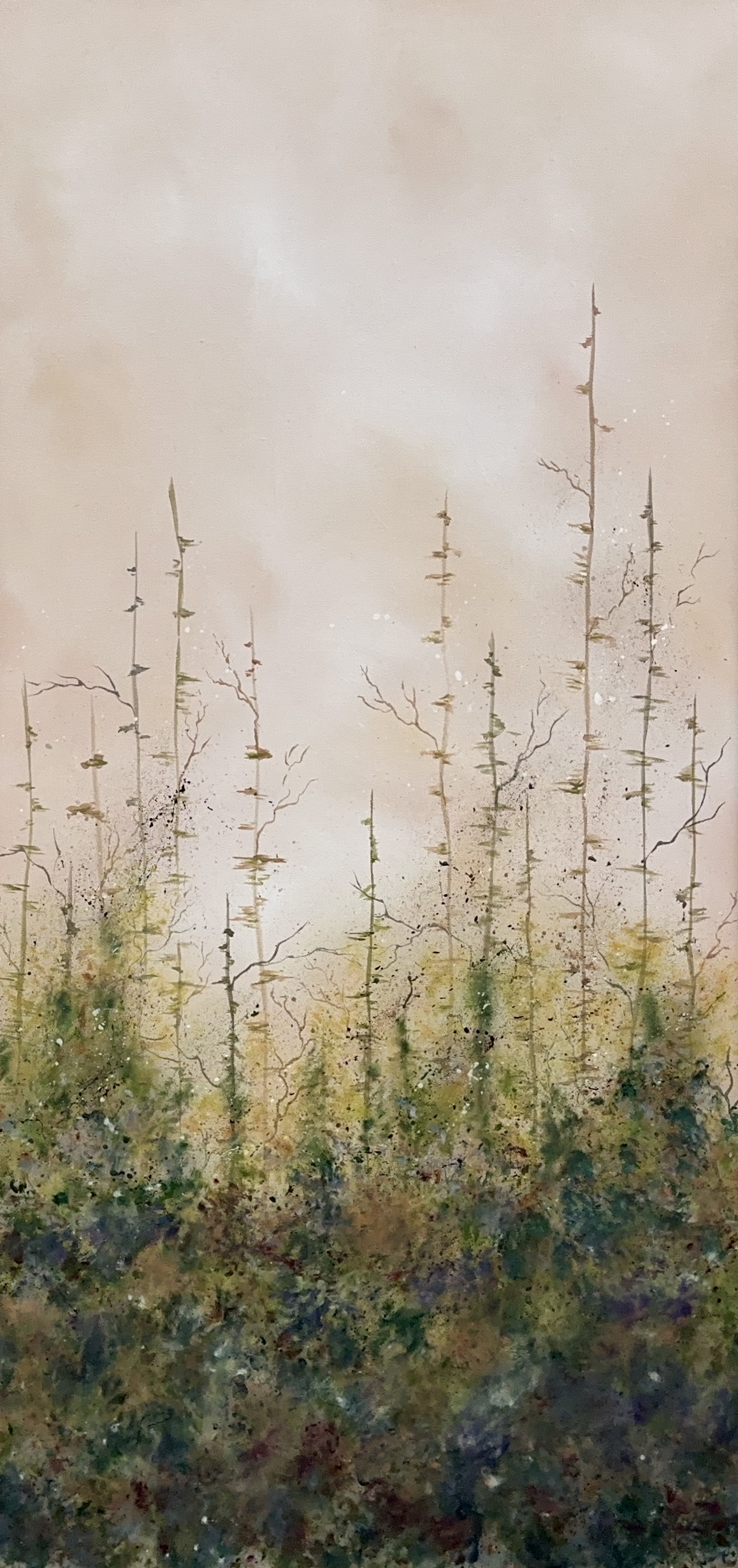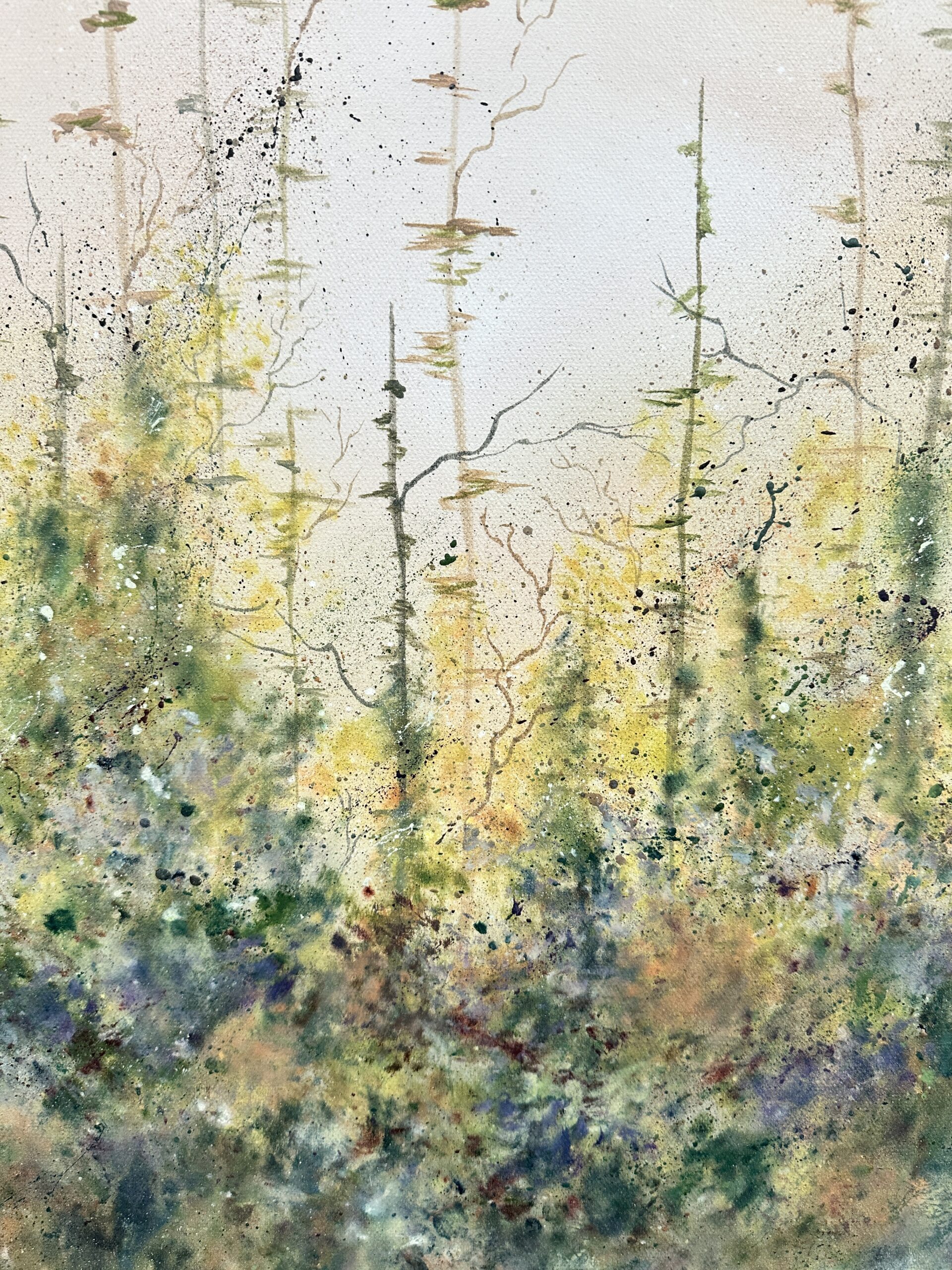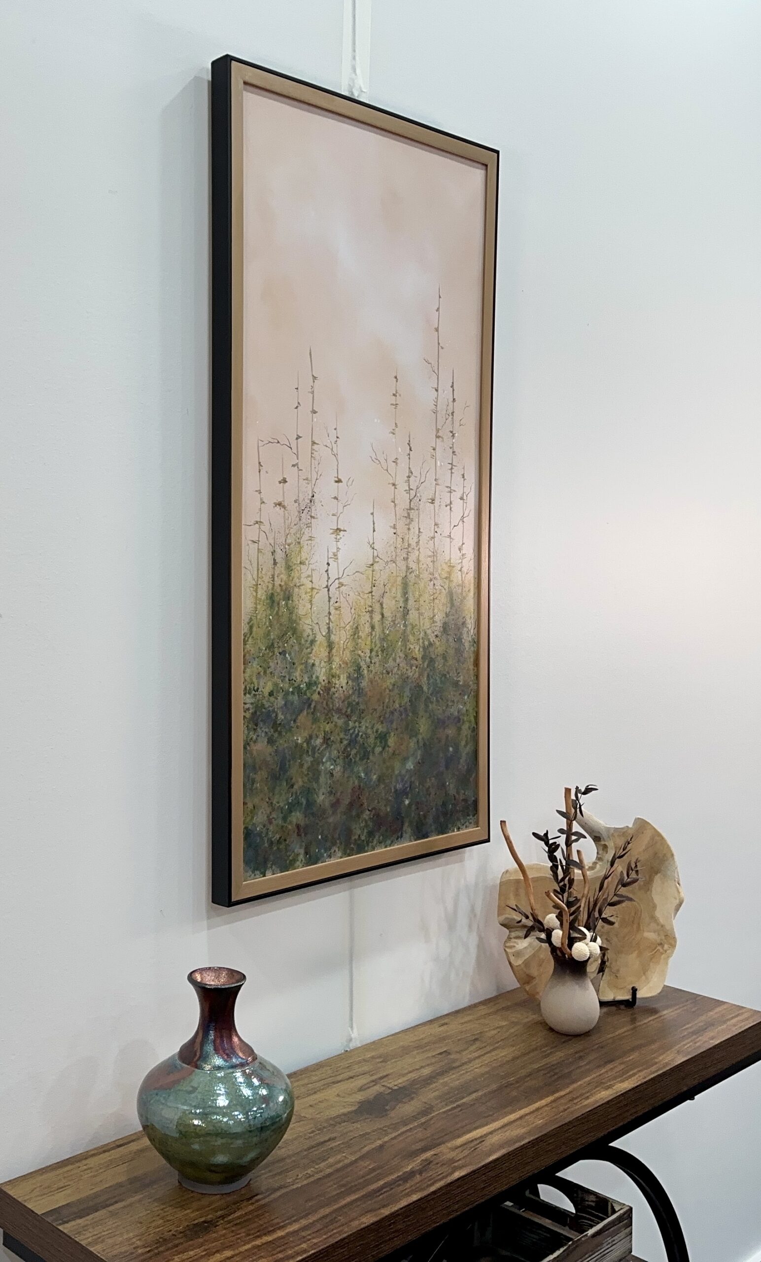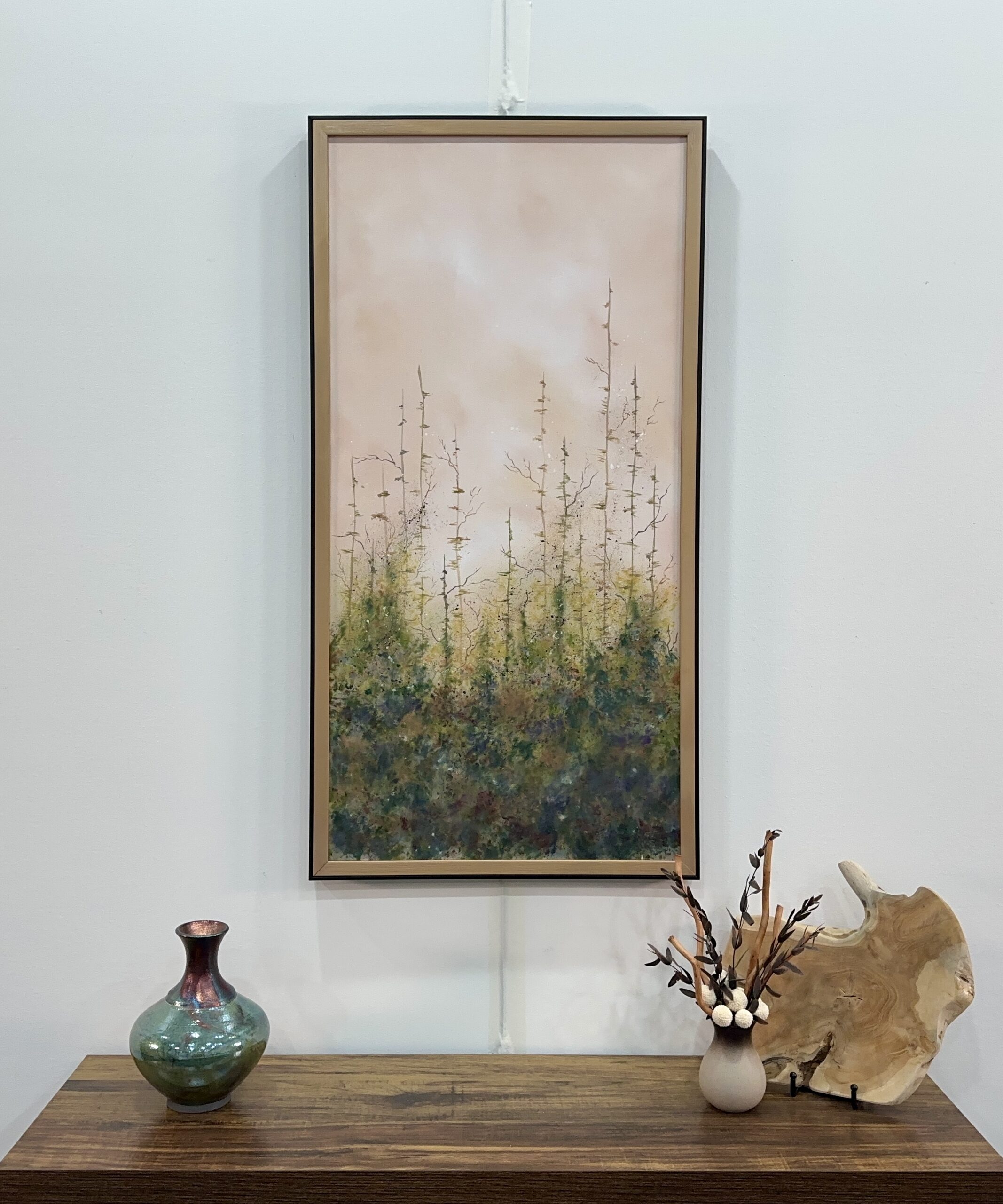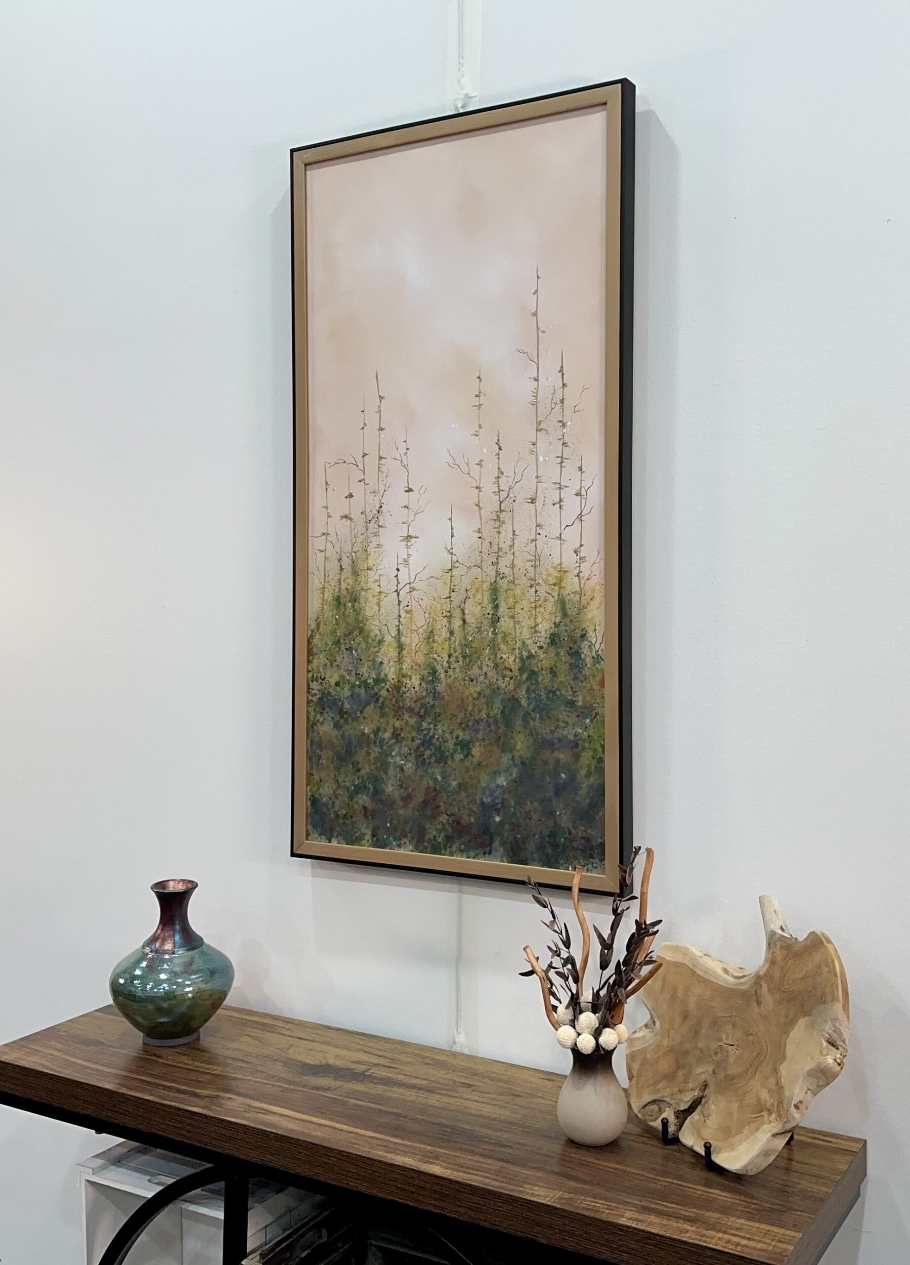 Acrylic on canvas. A soft sky peaks thru the tree tops leading the viewer onward. A metaphor for life’s journey, there is no path for us to follow, but it’s the journey that’s important. Companion piece to “Lumino Forest I”. 20+ layers of thin glazes. UV varnished. Framed. Wired and ready to hang.