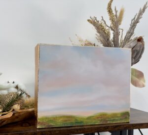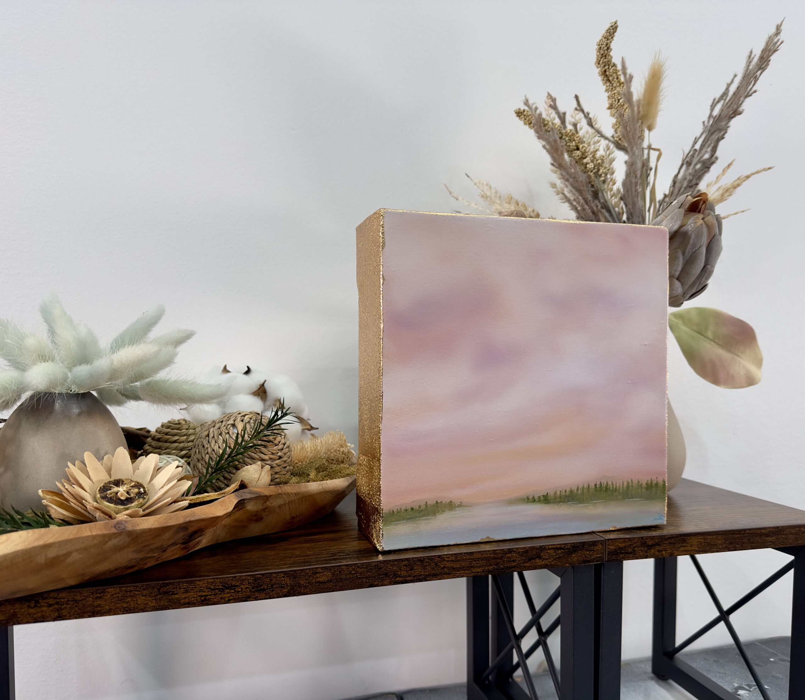 Acrylic on canvas. A vision of dawn when the world is softly awakening. These tiny landscapes can be set on a shelf as a decorative item or hung on a wall. Canvas edges are completely wrapped in gold leaf giving the painting an elegant ethereal feel. 2.5″ deep canvas. . UV varnished. Gold Leaf edged. Wired and ready to hang.