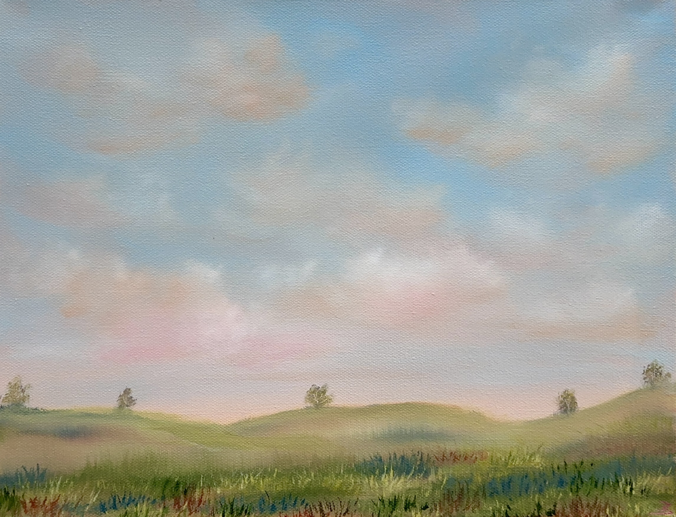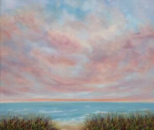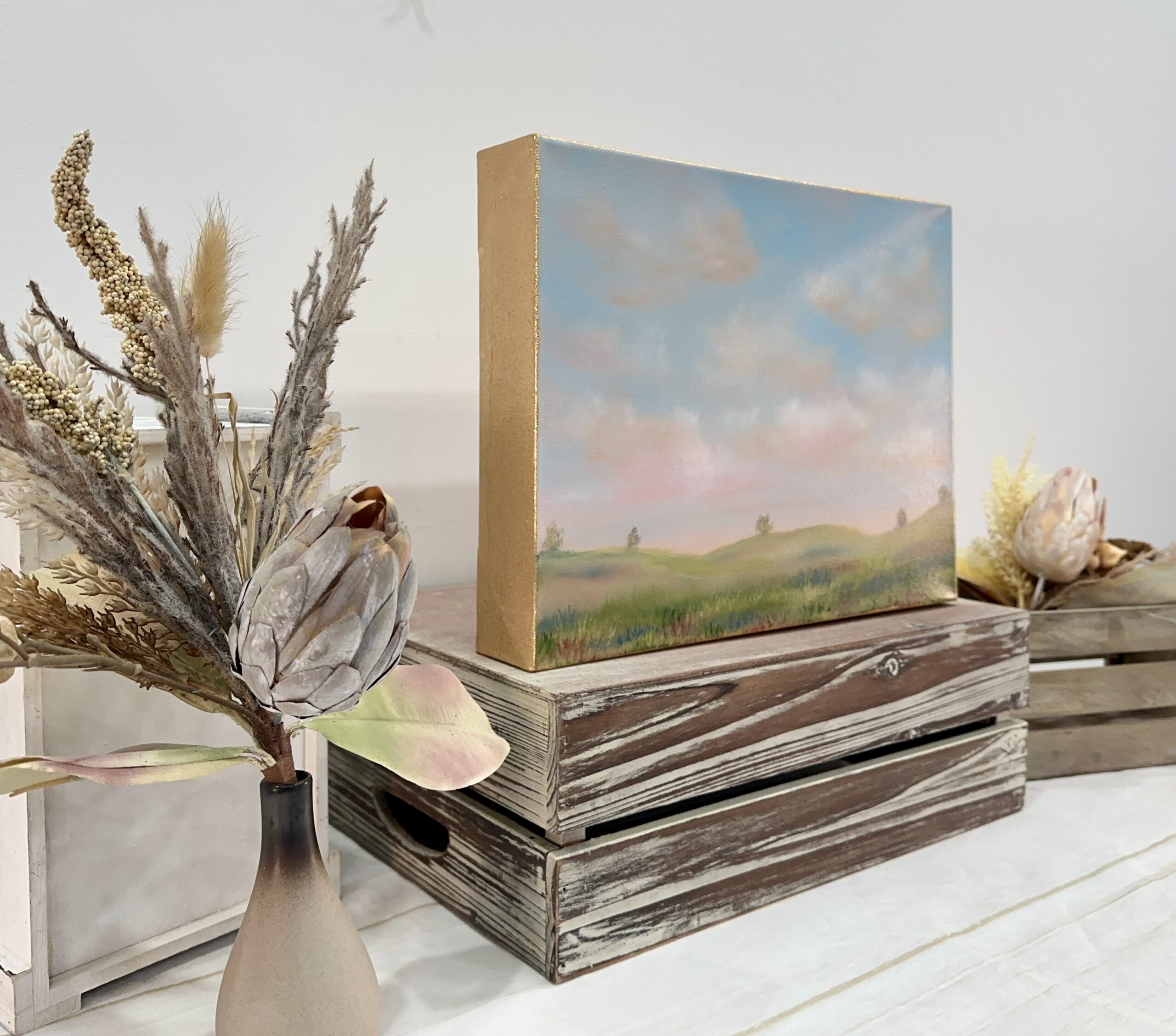 Acrylic on canvas. Delicately tinged clouds slowly drift over a wide open field. Wild grasses sway in the breeze. A perfect place for a summer stroll. These tiny landscapes can be set on a shelf as a decorative item or hung on a wall. Canvas edges are completely wrapped in gold leaf giving the painting an elegant ethereal feel. 2.5″ deep canvas. . UV varnished. Gold Leaf edged. Wired and ready to hang.