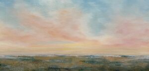 Acrylic on canvas. A place to breathe, a content sigh. A delicately tinged sky floats above a lush treeline and you can’t help but have a wistful sigh that everyday could hold such simple pleasure. 20+ glazing layers of paint. UV varnished. Framed. Wired and ready to hang.